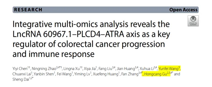 2025年6月,圣庭醫(yī)療聯(lián)合浙江大學(xué)醫(yī)學(xué)院附屬邵逸夫醫(yī)院以及中國科學(xué)院合肥研究院團(tuán)隊(duì),在國際頂級腫瘤學(xué)期刊 Molecular Cancer(IF=31.3,中科院一區(qū)TOP)發(fā)表了“Integrative multi-omics analysis reveals the LncRNA 60967.1-PLCD4-ATRA axis as a key regulator of colorectal cancer progression and immune response”。